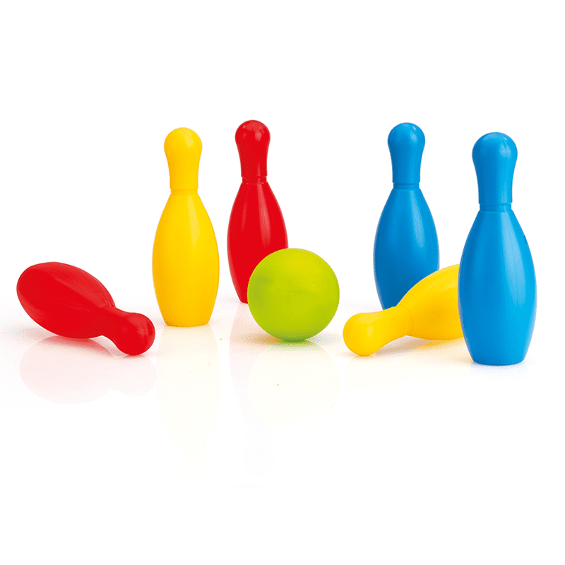 L’ensemble comprend 6 broches – 2x jaunes, 2x bleues et 2x rouges et 1x boule de bowling verte.