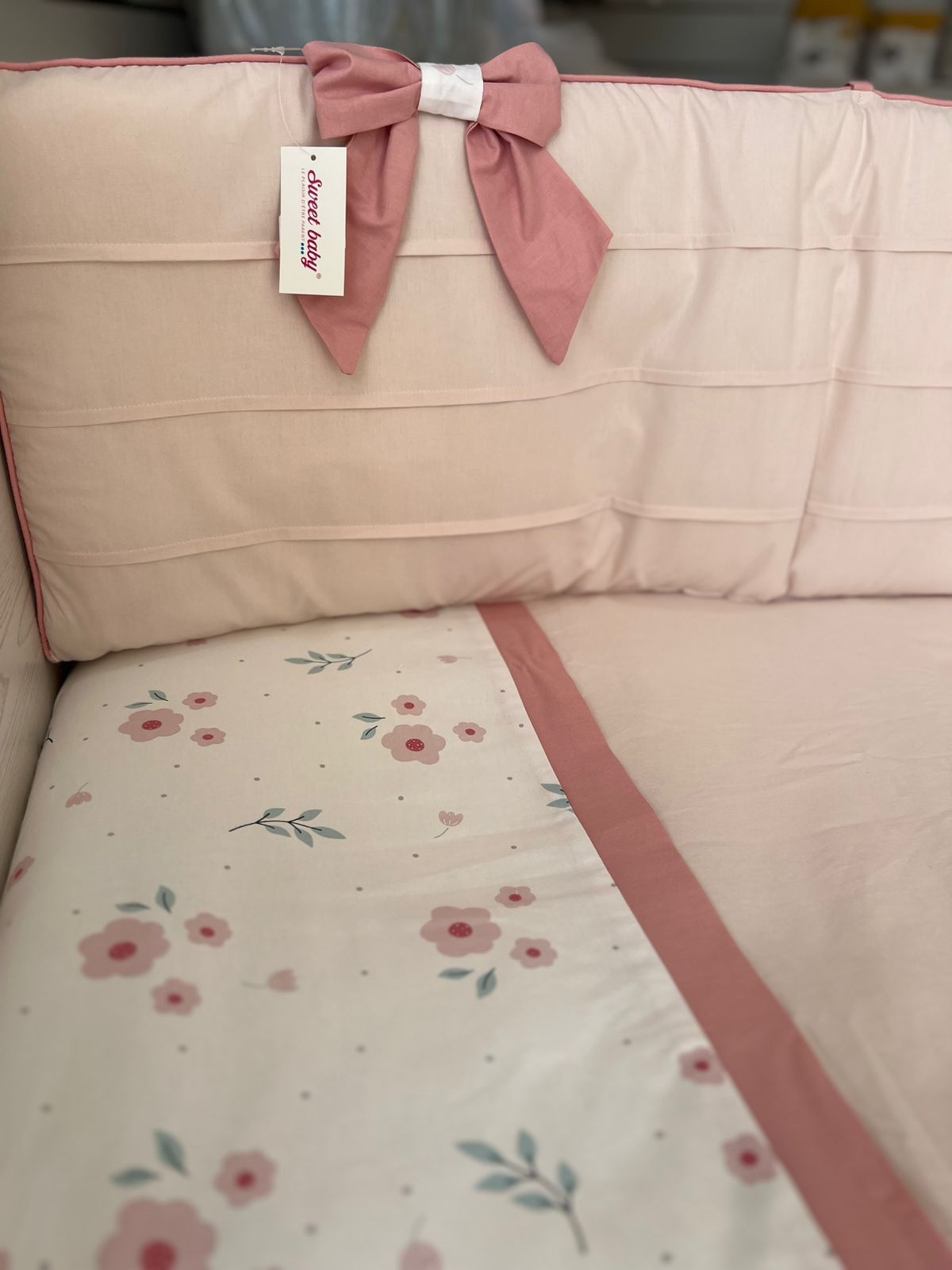Cet élégant ensemble de literie pour bébé apporte une ambiance douce et chaleureuse grâce à ses tons roses poudrés et ses motifs floraux délicats. Le lit est habillé d’un tour de lit rembourré, composé de panneaux moelleux offrant confort et sécurité à bébé.