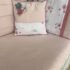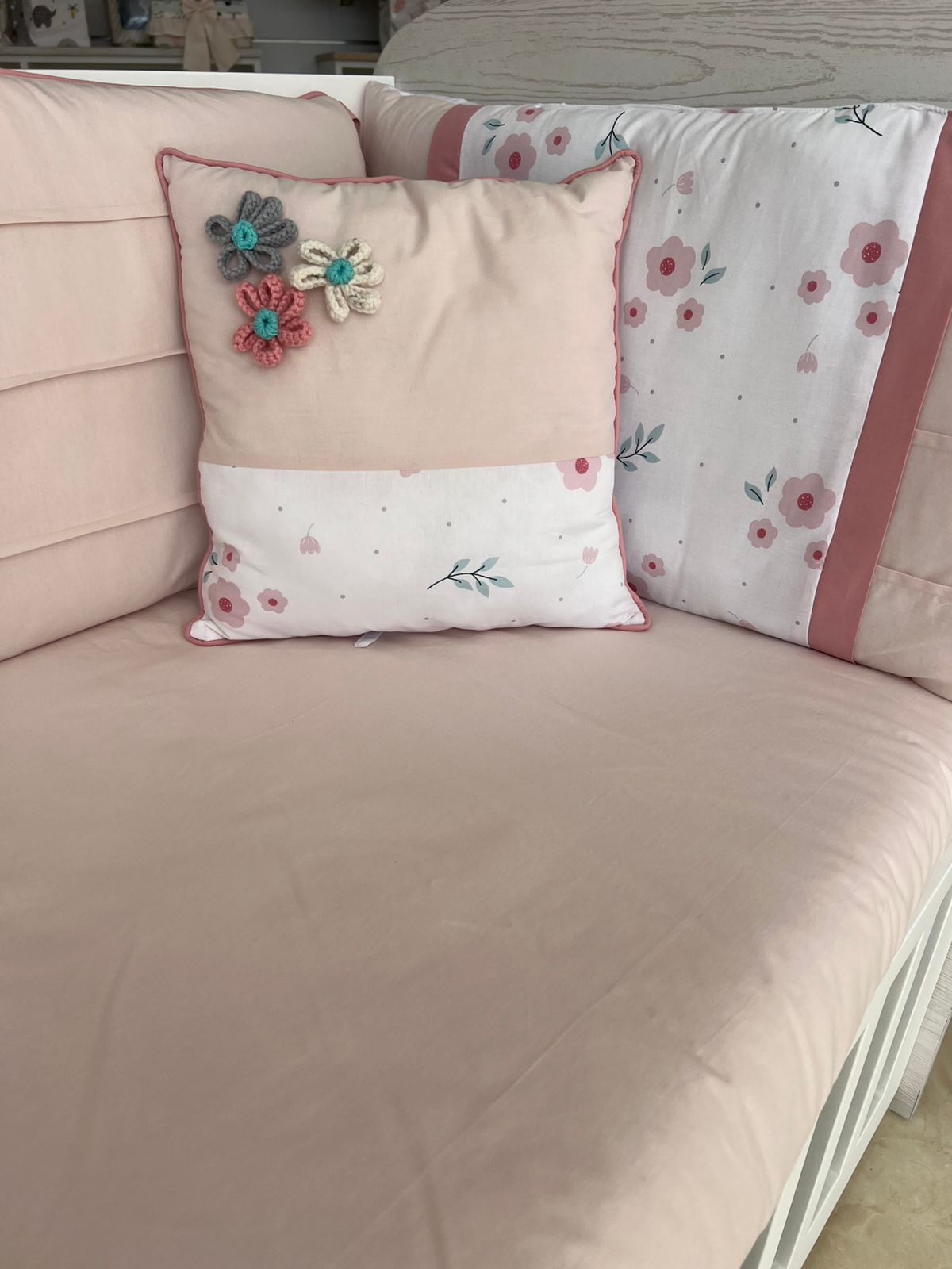 Une tresse fixé sur le tour de lit ajoute une note raffinée et élégante. L’ensemble est complété par un coussin décoratif orné de petites fleurs en tissu, apportant une touche artisanale et charmante.