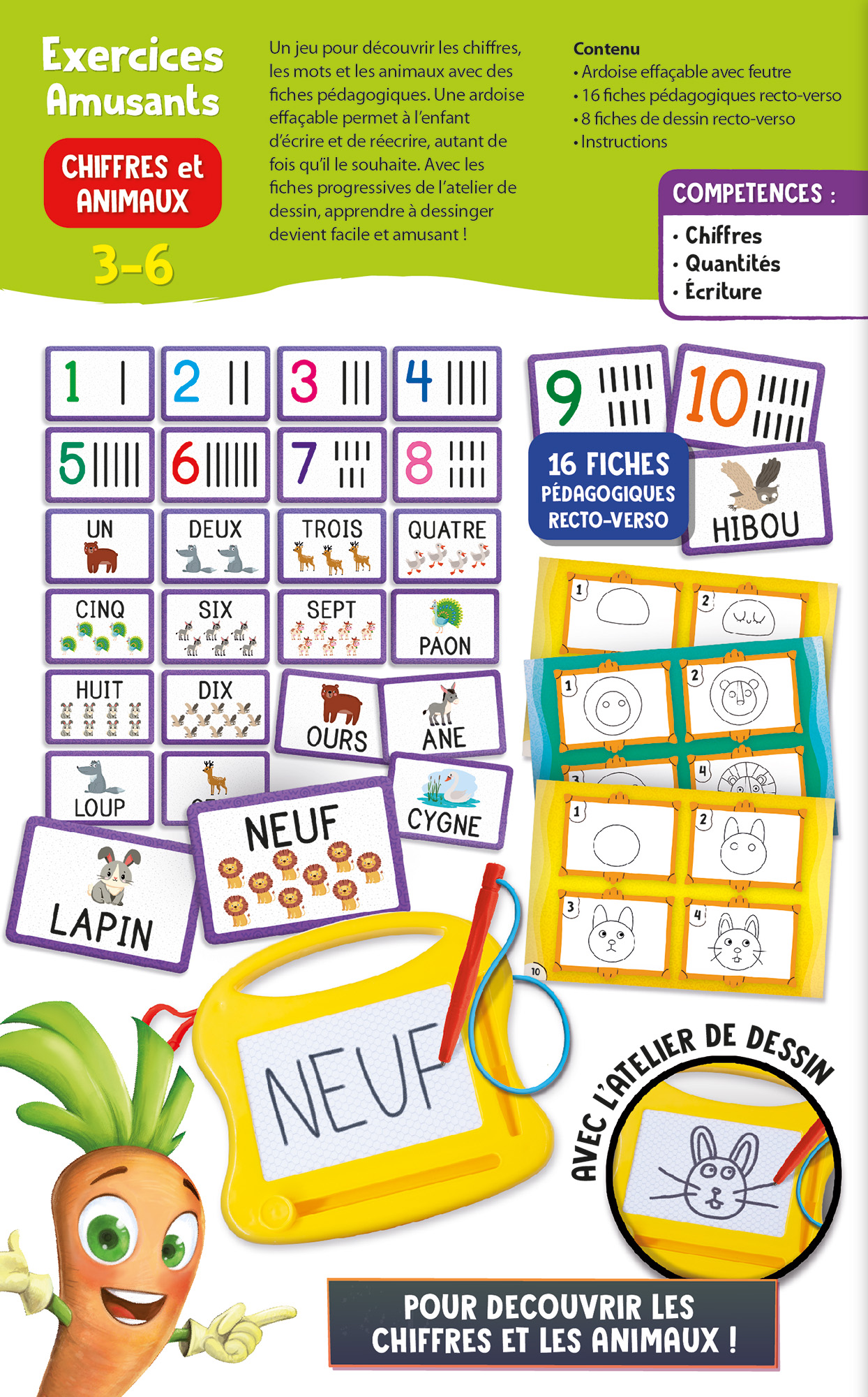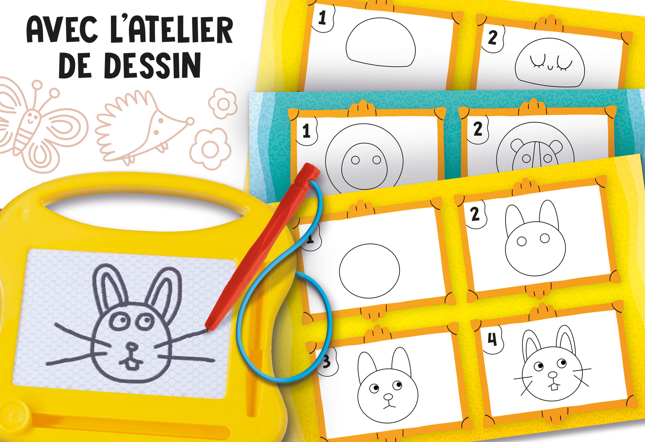 Un jeu pour découvrir les chiffres, des mots et les animaux avec des fiches pédagogiques et une ardoise effaçable, qui permet à l’enfant d’écrire et de réécrire autant de fois qu’il le souhaite ! Avec les fiches progressives de l’atelier de dessin, apprendre à dessiner est facile et amusant !
