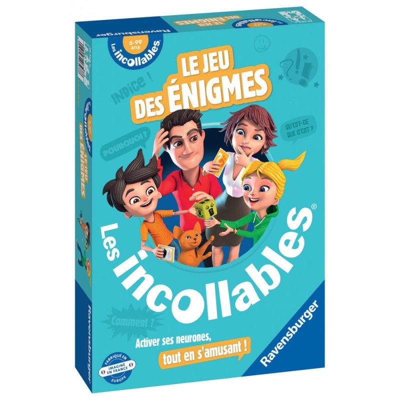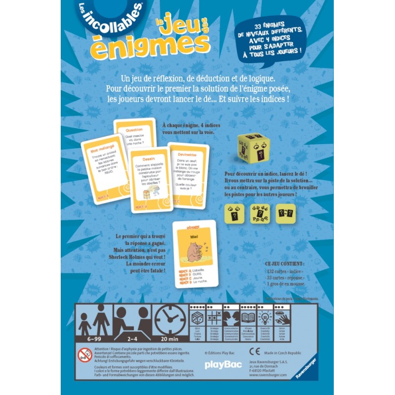 Un jeu de cartes, un gros dé en mousse et 33 énigmes à découvrir ! Pour résoudre une énigme, c’est très simple, il faut être le premier à découvrir les 4 indices qui se cachent derrière une devinette, une charade, un rébus ou un jeu de logique … Mais attention, le dé en mousse rythme le jeu et ne permet pas toujours à tout le monde de voir les indices ! Faites preuve de réflexion, de déduction et d’un peu de tactique pour trouver un maximum d’énigmes !