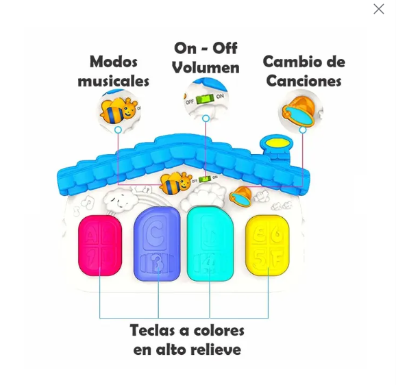 - Le clavier du piano joue des chansons et des mélodies joyeuses lorsqu’on appuie dessus avec les mains ou les pieds favorisant ainsi l’éveil musical le sens du rythme et la coordination.
